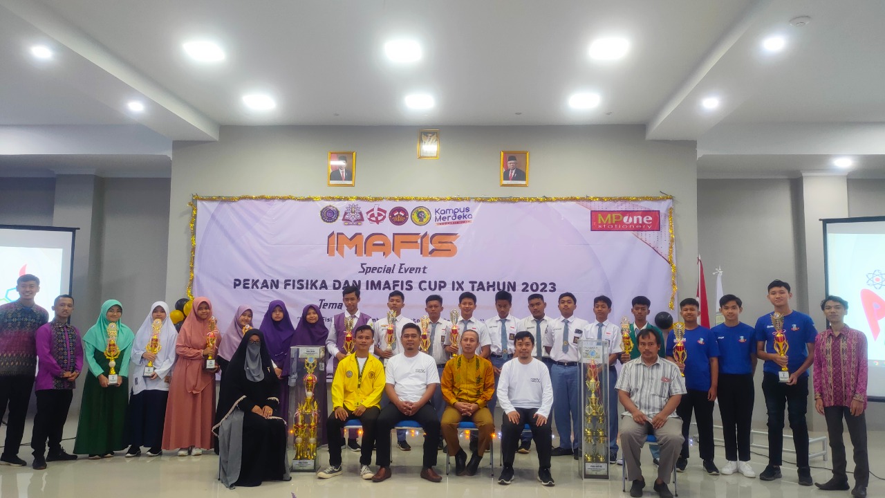 Gambar. Foto bersama setelah pembagian piala dan sertifikat dosen prodi pendidikan fisika, dewan guru pendamping dan para juara dari seluruh cabang perlobaan dalam acara pekan fisika ke IX tahun 2023.